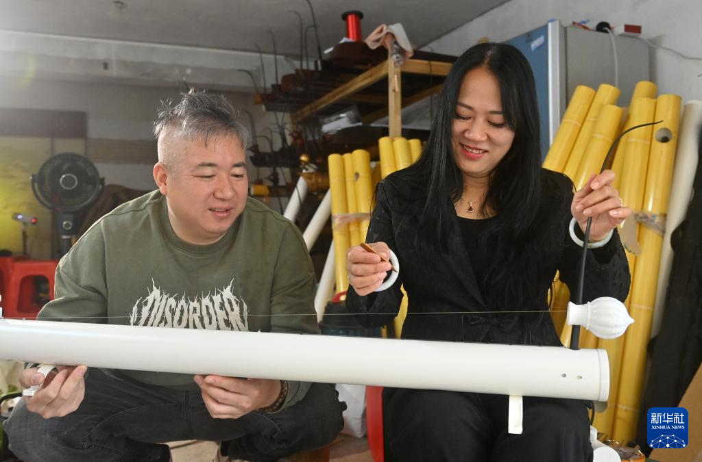 2月7日,苏海珍(右)和爱人时茂繁弹奏一款创新版独弦琴。
