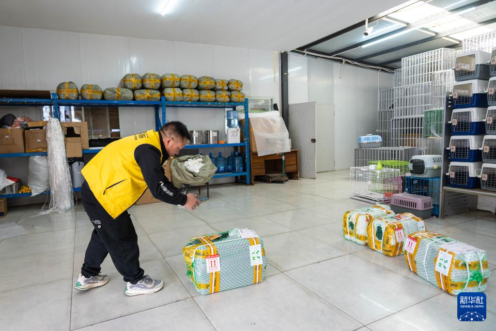1月31日,在云南省昆明市,空运出发前,一家宠物托运公司的工作人员为打包好的托运宠物拍照记录,并同步给顾客。