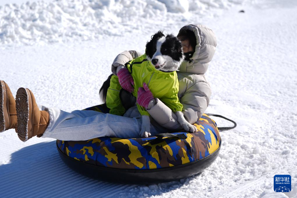 2月7日,在北京渔阳·宠趣里宠物滑雪主题乐园,一名游客带着宠物狗一起坐雪圈参加雪地保龄球趣味游戏。据“宠趣里”乐园负责人介绍,乐园自2025年12月22日开放以来,已累计接待近千只宠物狗。