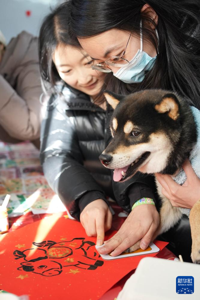 1月31日,在北京市昌平区举行的一场宠物庙会上,宠物狗在福字上拓印爪印。