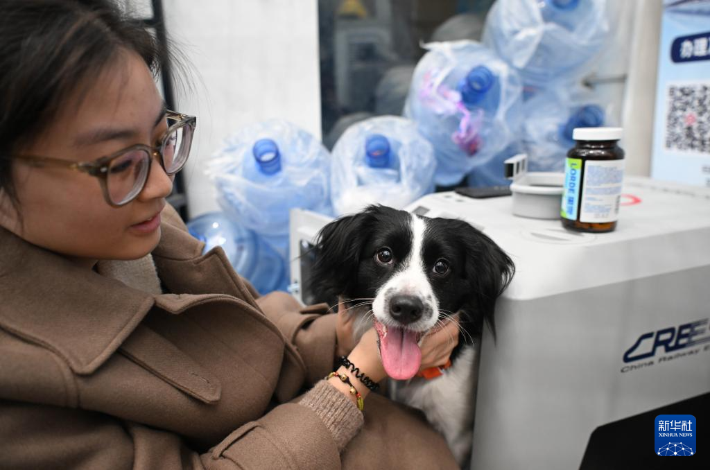 2月3日,在深圳北站中铁快运营业部,吴滢安抚她的宠物狗进入宠物托运专用箱。