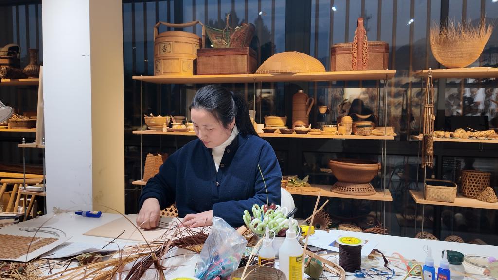 2月3日傍晚,在杭州市余杭区青山村的“艺启共富坊”里,“新村民”李俊转正在制作竹编制品。她依托村里资源在此创业,还日常教授竹编技艺。新华社记者张璇 摄