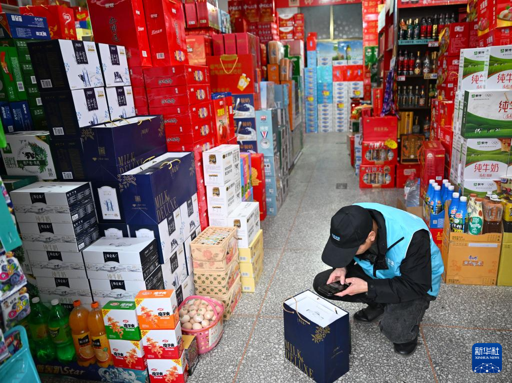 2月9日,在河南省周口市鹿邑县玄武镇一家超市内,马高杰查看牛奶生产日期。