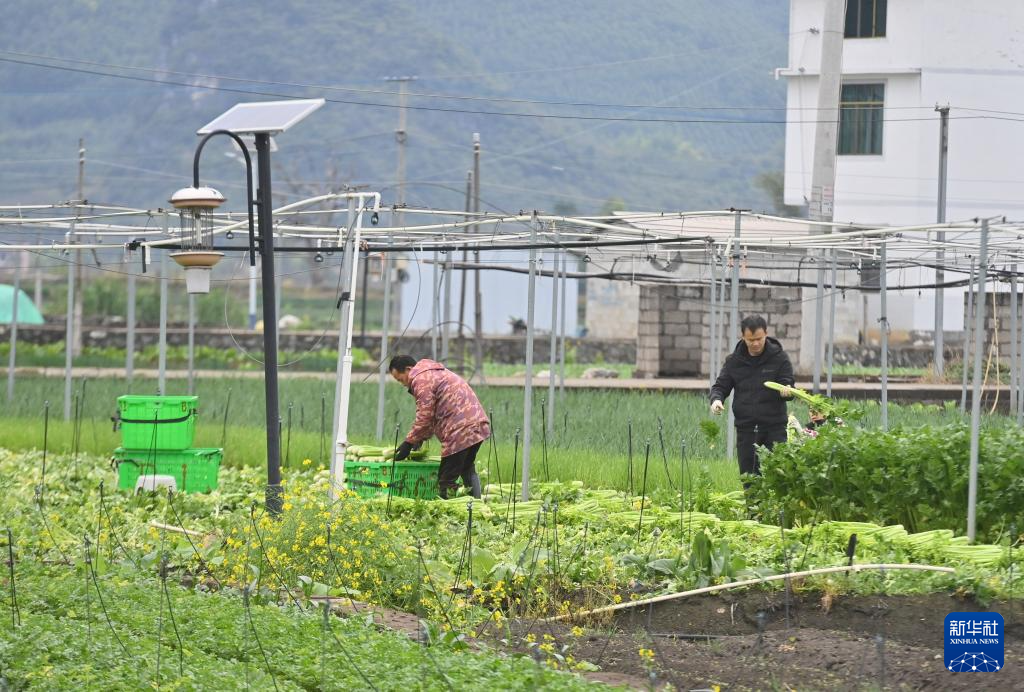 2月11日,在柳州市柳江区三都镇觉山村,村民在田间采收蔬菜。