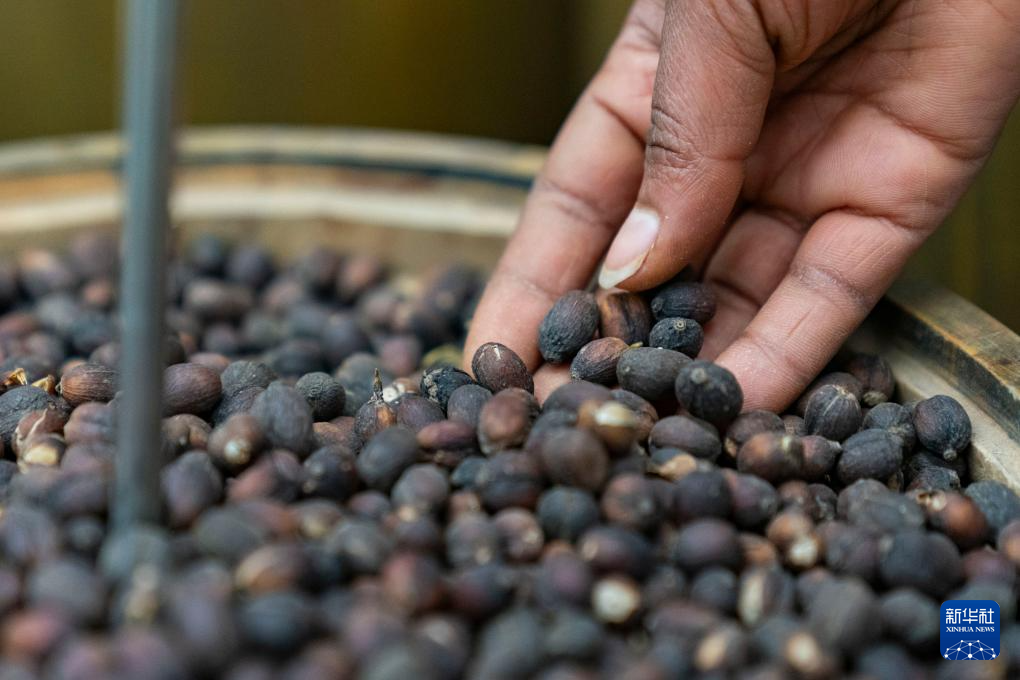 2月13日,在埃塞俄比亚首都亚的斯亚贝巴的一家咖啡加工厂,工作人员查看经过日晒处理的咖啡果。