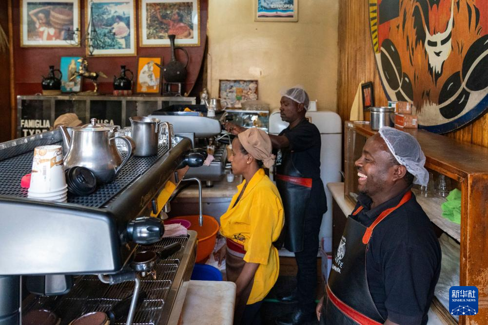 2月12日,在埃塞俄比亚首都亚的斯亚贝巴的一家咖啡店,店员为顾客制作咖啡。