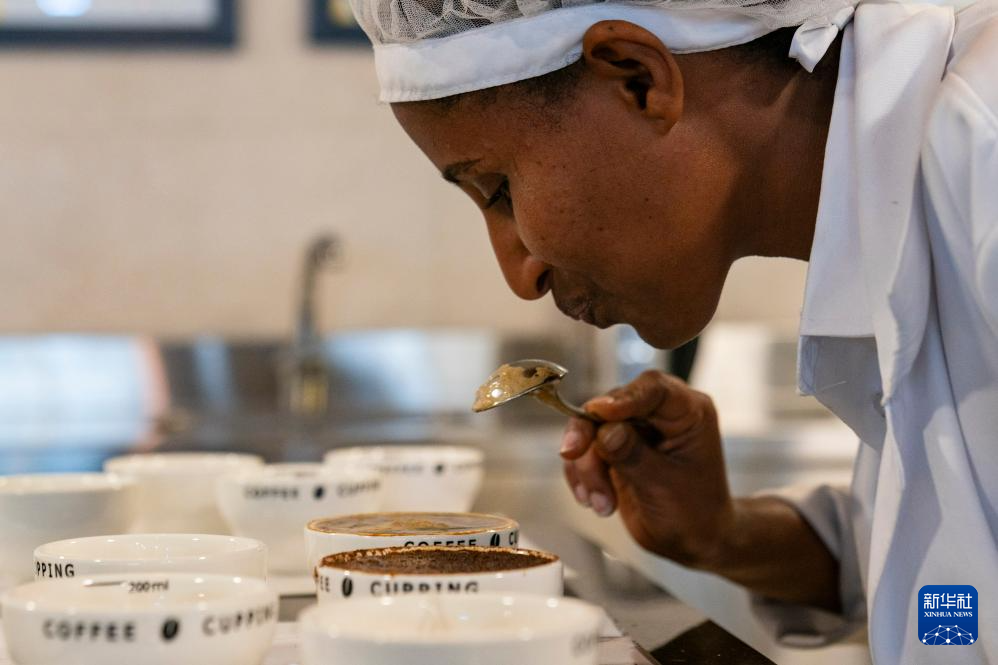 2月13日,在埃塞俄比亚首都亚的斯亚贝巴的一家咖啡加工厂,工作人员在品鉴咖啡。
