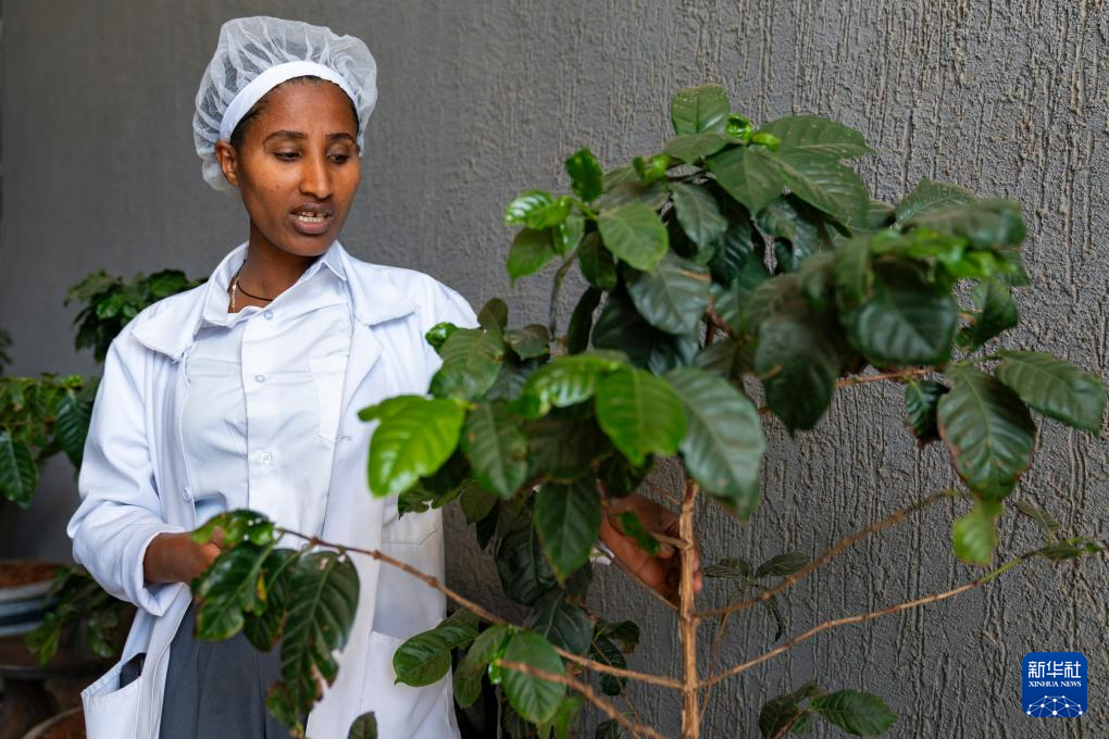 2月13日,在埃塞俄比亚首都亚的斯亚贝巴的一家咖啡加工厂,工作人员在讲解咖啡树的相关知识。
