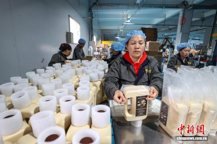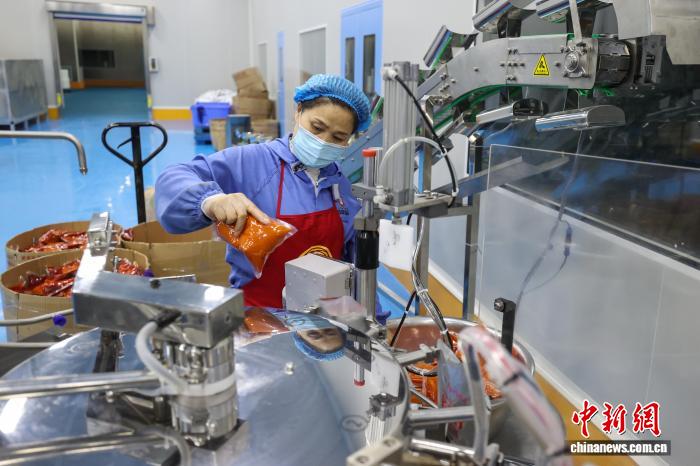2月25日,贵州省黔南州龙里县一家辣椒加工企业生产车间,工人在包装酸汤产品。 春节假期过后,龙里县众多工业企业复工生产,加紧赶制各类订单产品保障市场供应,生产车间内一派繁忙景象。中新社记者 瞿宏伦 摄