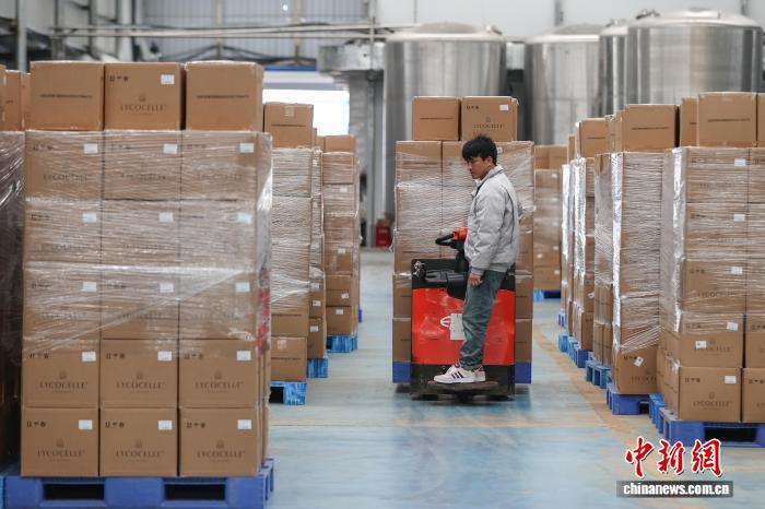 2月25日,贵州省黔南州龙里县一家日化企业生产车间,工人在转运待出厂的产品。 春节假期过后,龙里县众多工业企业复工生产,加紧赶制各类订单产品保障市场供应,生产车间内一派繁忙景象。中新社记者 瞿宏伦 摄