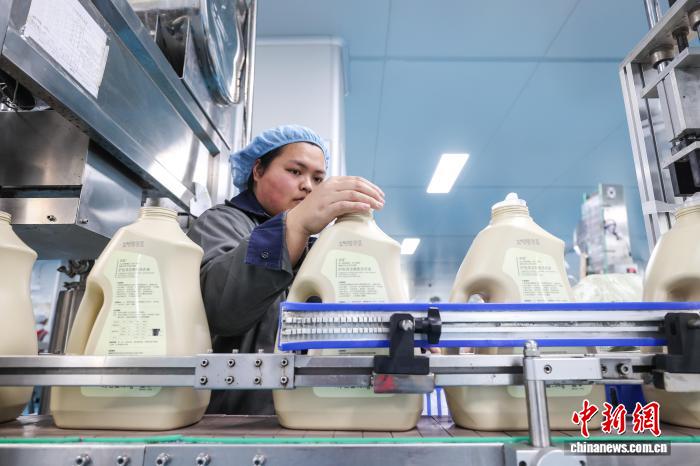 2月25日,贵州省黔南州龙里县一家日化企业生产车间,工人在洗衣液生产线作业。 春节假期过后,龙里县众多工业企业复工生产,加紧赶制各类订单产品保障市场供应,生产车间内一派繁忙景象。中新社记者 瞿宏伦 摄