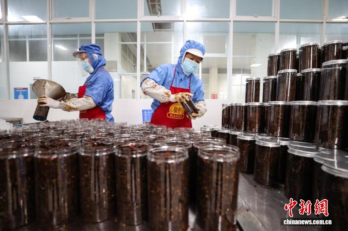 2月25日,贵州省黔南州龙里县一家辣椒加工企业生产车间,工人在罐装辣椒。 春节假期过后,龙里县众多工业企业复工生产,加紧赶制各类订单产品保障市场供应,生产车间内一派繁忙景象。中新社记者 瞿宏伦 摄