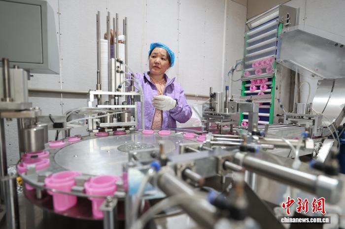 2月25日,贵州省黔南州龙里县一家日化企业生产车间,工人在加工洗衣液瓶盖。 春节假期过后,龙里县众多工业企业复工生产,加紧赶制各类订单产品保障市场供应,生产车间内一派繁忙景象。中新社记者 瞿宏伦 摄