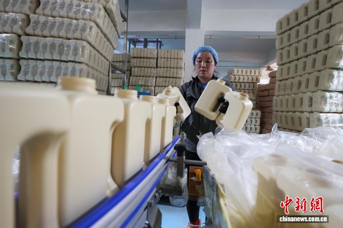 2月25日,贵州省黔南州龙里县一家日化企业生产车间,工人在包装待出厂的洗衣液。 春节假期过后,龙里县众多工业企业复工生产,加紧赶制各类订单产品保障市场供应,生产车间内一派繁忙景象。中新社记者 瞿宏伦 摄