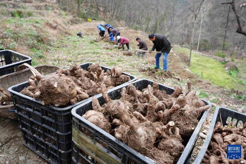 3月3日,陕西省旬阳市段家河镇弥陀寺村村民在村上的产业园中收魔芋。