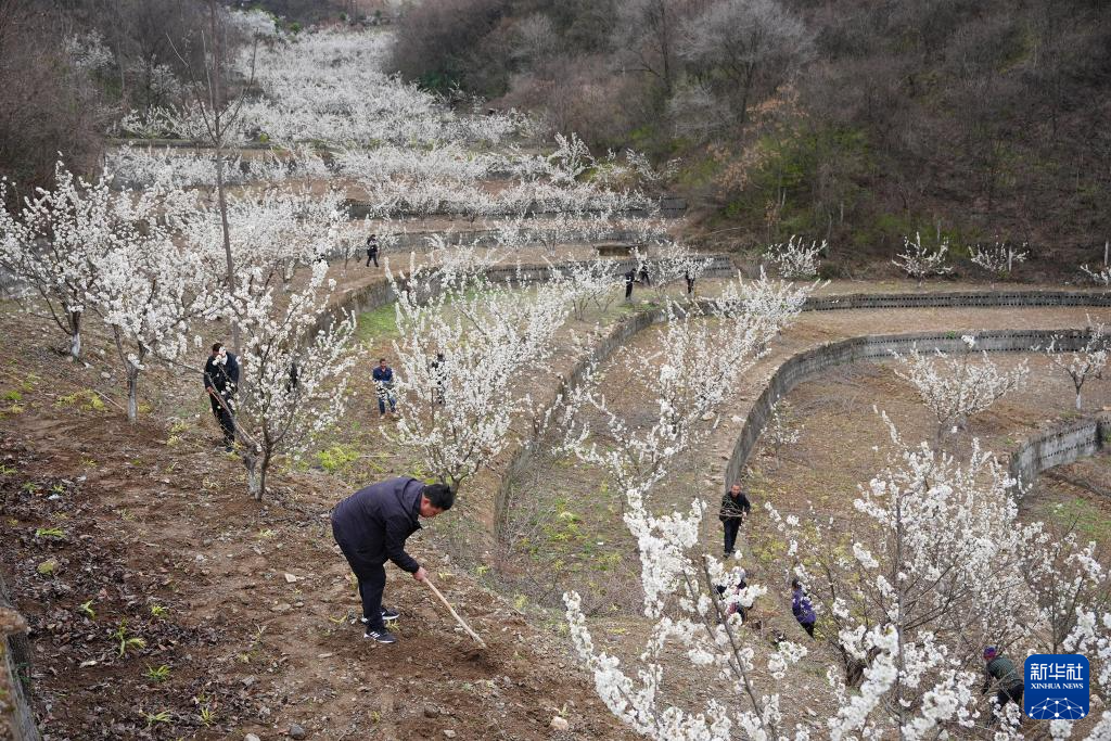 3月3日,在旬阳市段家河镇薛家湾社区樱桃园内,镇村干部和村民一起开展园区春管工作。