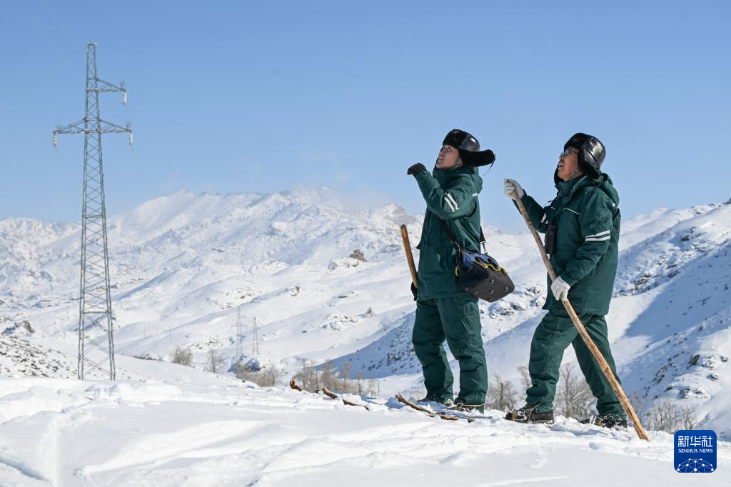 在新疆阿勒泰市汗德尕特蒙古族乡汗德尕特村,巴图别勒克·吾齐克(右)和徒弟叶思哈提·努尔兰穿着毛皮滑雪板在山上巡线(2月24日摄)。