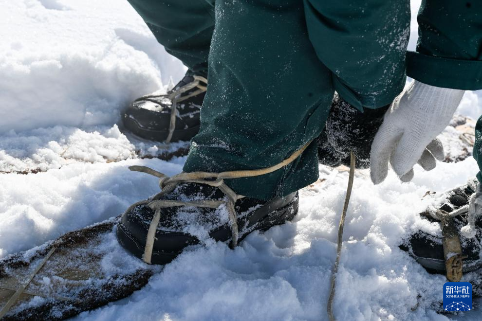 在新疆阿勒泰市汗德尕特蒙古族乡汗德尕特村,国网新疆电力有限公司阿勒泰供电公司汗德尕特乡供电所供电服务工叶思哈提·努尔兰在上山巡线前穿戴毛皮滑雪板(2月24日摄)。