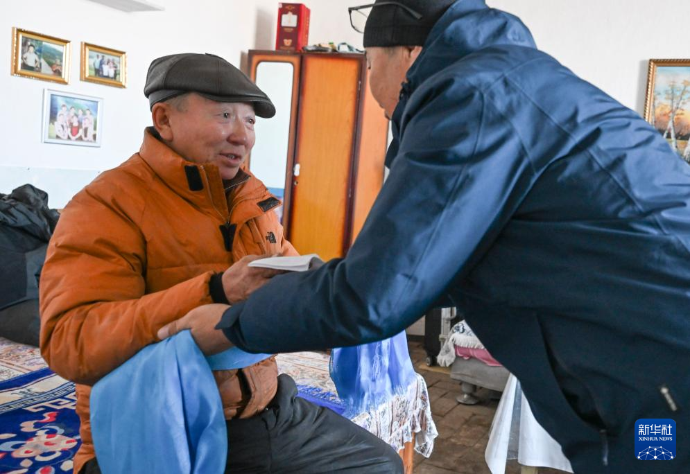 在新疆阿勒泰市汗德尕特蒙古族乡汗德尕特村,巴图别勒克·吾齐克(右)来到铁木尔加甫·卡汗别力克家中给他拜年(2月25日摄)。