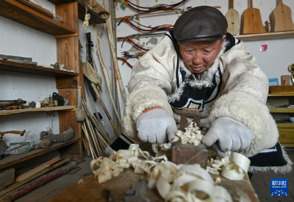 在新疆阿勒泰市汗德尕特蒙古族乡汗德尕特村,铁木尔加甫·卡汗别力克将制作雪板的木材刨平整(2月24日摄)。