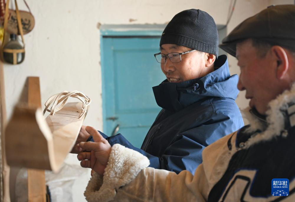 在新疆阿勒泰市汗德尕特蒙古族乡汗德尕特村,巴图别勒克·吾齐克(左)在查看铁木尔加甫·卡汗别力克为其定做的雪板木材(2月24日摄)。