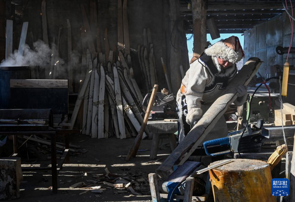 在新疆阿勒泰市汗德尕特蒙古族乡汗德尕特村,铁木尔加甫·卡汗别力克准备进一步加工用来制作雪板的木材(2月25日摄)。