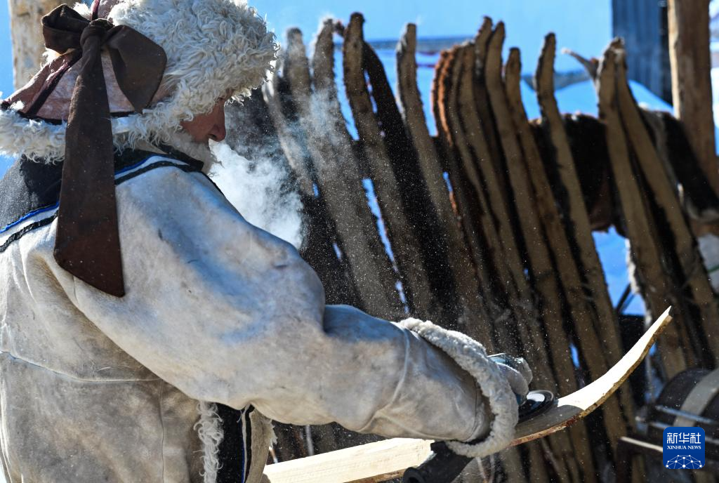 在新疆阿勒泰市汗德尕特蒙古族乡汗德尕特村,铁木尔加甫·卡汗别力克在打磨用来制作雪板的木材(2月25日摄)。