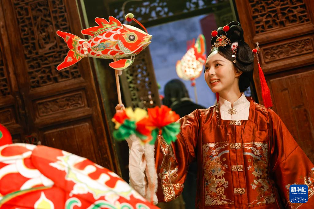 2月14日,在安徽省黄山市歙县北岸镇瞻淇村,游客手持鱼灯留影。