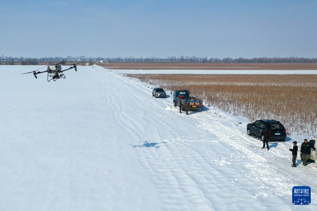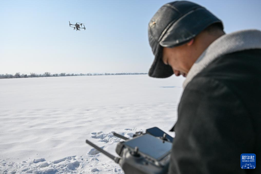 在新疆昌吉回族自治州玛纳斯县乐土驿镇,飞手操作无人机播撒返青肥料(3月4日摄,无人机照片)。