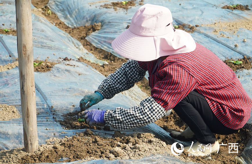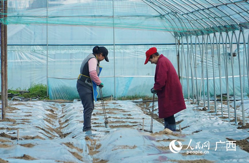 工人正在给地膜打孔
