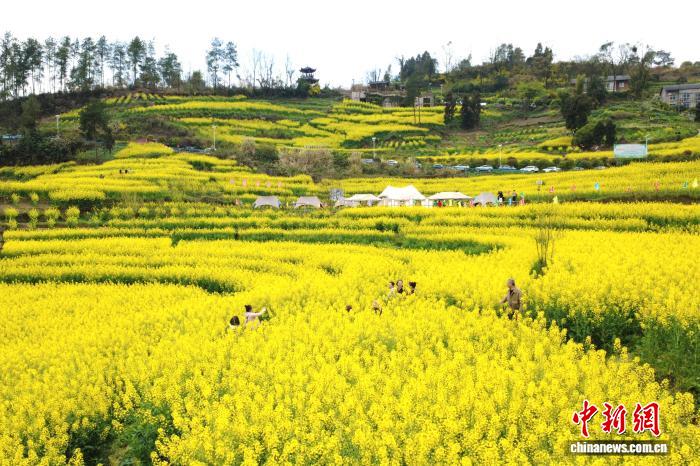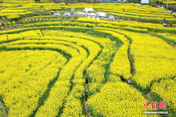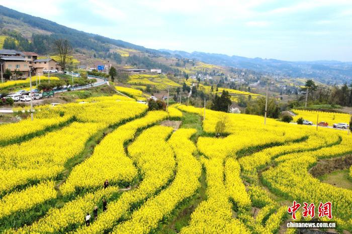 3月6日,“文蔚庙垭·梦里老家”重庆武隆庙垭油菜花节启幕。万亩梯田油菜花盛开,山坡被“染”成金黄。层层叠叠的油菜花随着山势连绵起伏,吸引众多游客前来赏花拍照。图为重庆武隆庙垭梯田油菜花盛开。(无人机照片)中新社记者 肖江川 摄