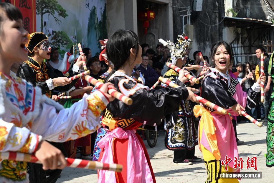 3月8日,蓓蕾幼儿园英歌队在广东省潮州市金石镇辜厝村表演,展现英歌舞的魅力和风采。