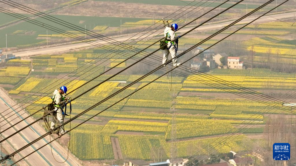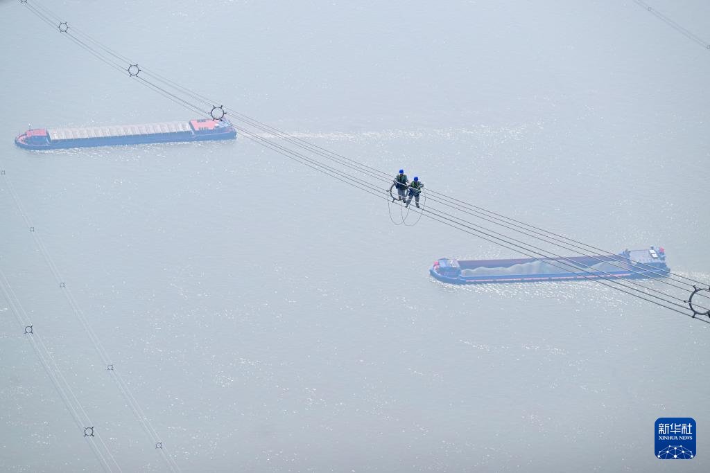 近日,我国“西电东送”重要通道——±800千伏特高压金塘线启动全面检修。在安徽省铜陵市枞阳县长江边,检修工人穿戴专业防护设备,在最高达345米的特高压输电线路上攀爬走线、精心作业,保障输电线路安全。