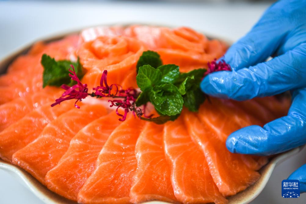 3月10日,工人在贵州省岑巩县淡水渔业基地将三文鱼切片摆盘。