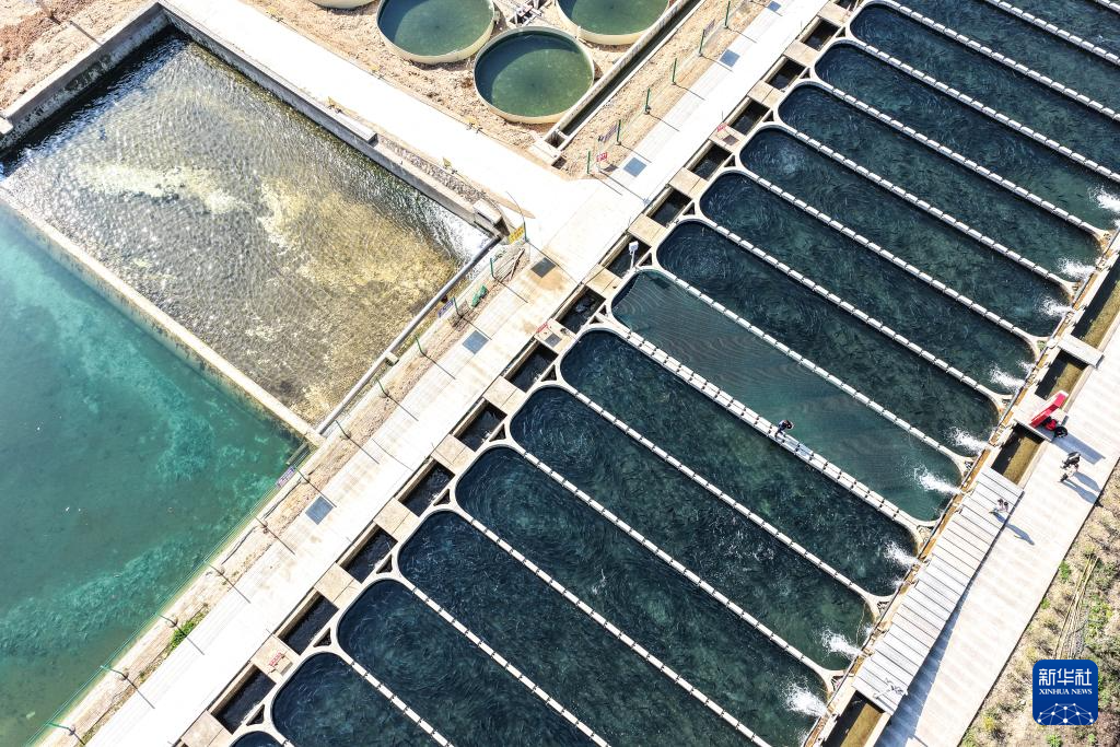 3月10日,工人在贵州省岑巩县淡水渔业基地给三文鱼投食(无人机照片)。
