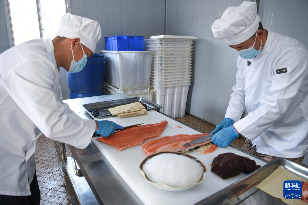3月10日,工人在贵州省岑巩县淡水渔业基地将三文鱼切片摆盘。