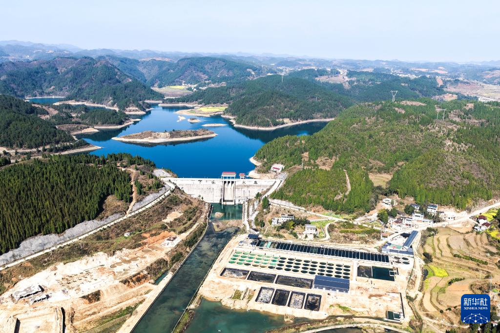 这是3月10日拍摄的贵州省岑巩县淡水渔业基地养殖场景,远处是紧邻的下溪水库水源点(无人机照片)。