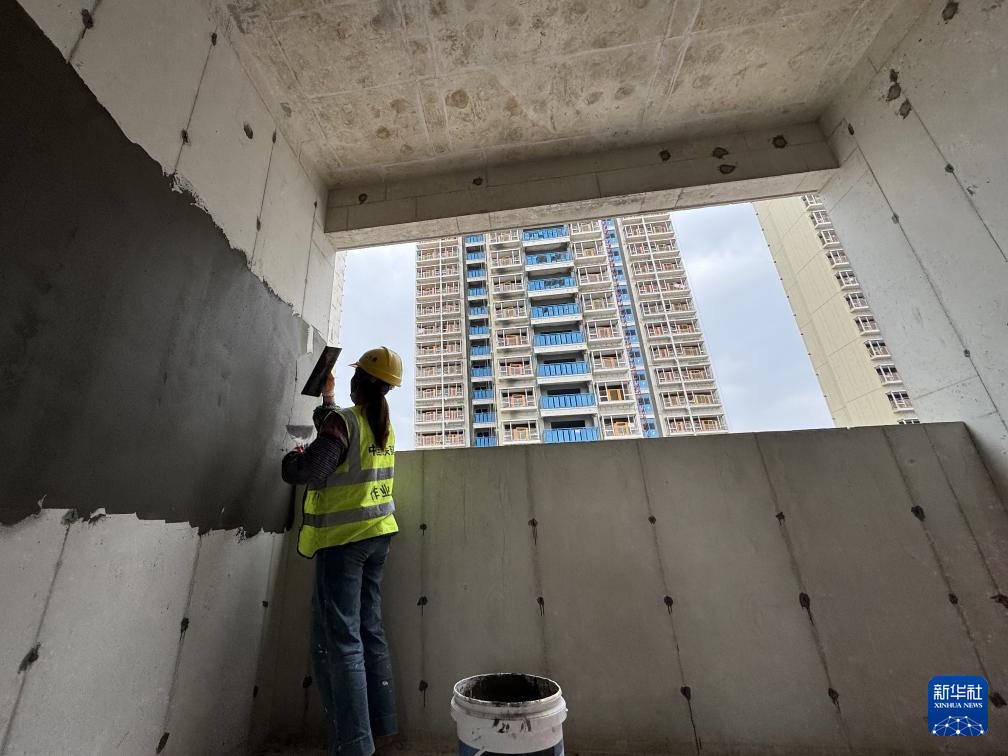 3月16日,在南宁市鸡村城中村改造项目建设现场,中铁二十局工人给房间刮防水砂浆。