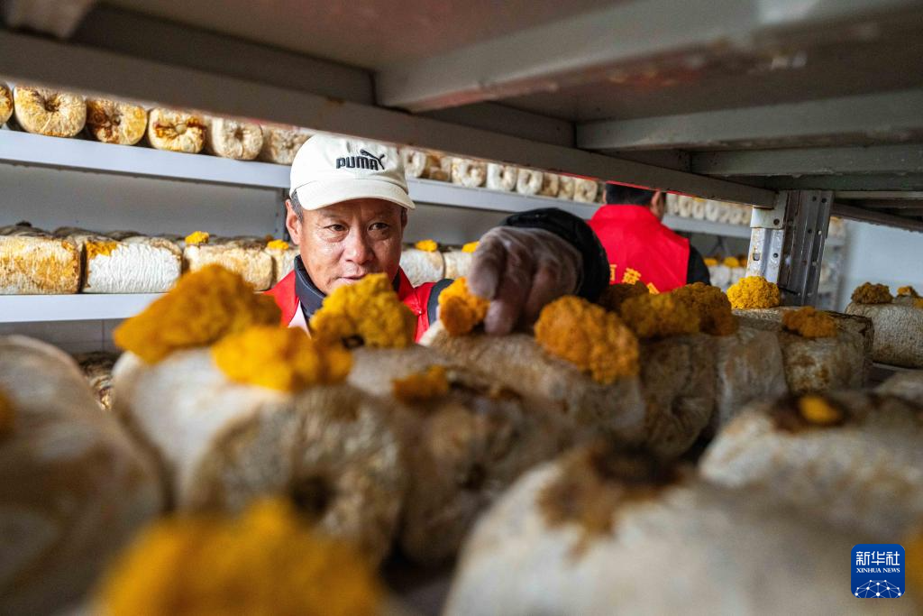 3月17日,在湖南省长沙市望城区靖港镇采丰蘑菇种植园,村民在采摘金耳。