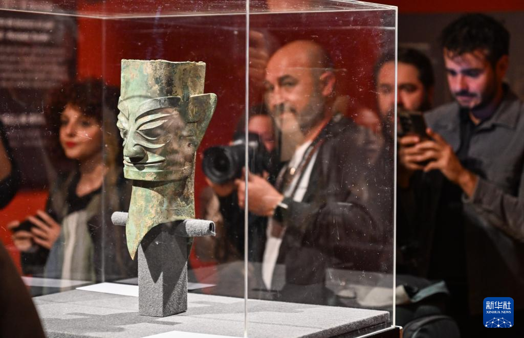 3月17日,在西班牙瓜达拉哈拉博物馆,人们参观中国西南地区青铜文明展上来自三星堆遗址的展品青铜人头像。