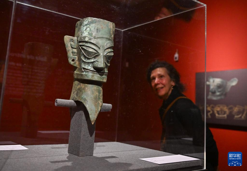 3月17日,在西班牙瓜达拉哈拉博物馆,一名女子参观中国西南地区青铜文明展上来自三星堆遗址的展品青铜人头像。
