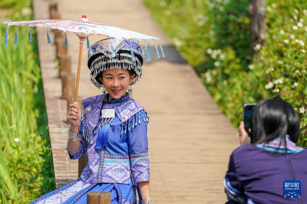 3月17日,游客在坝美景区身着少数民族服饰拍照。