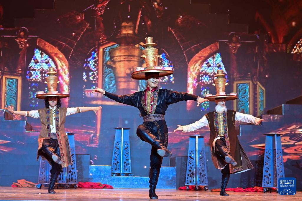 在新疆库车市大馕城,演员在大型沉浸式歌舞剧《杏花之约·丝路龟兹》中表演(2024年4月1日摄)。