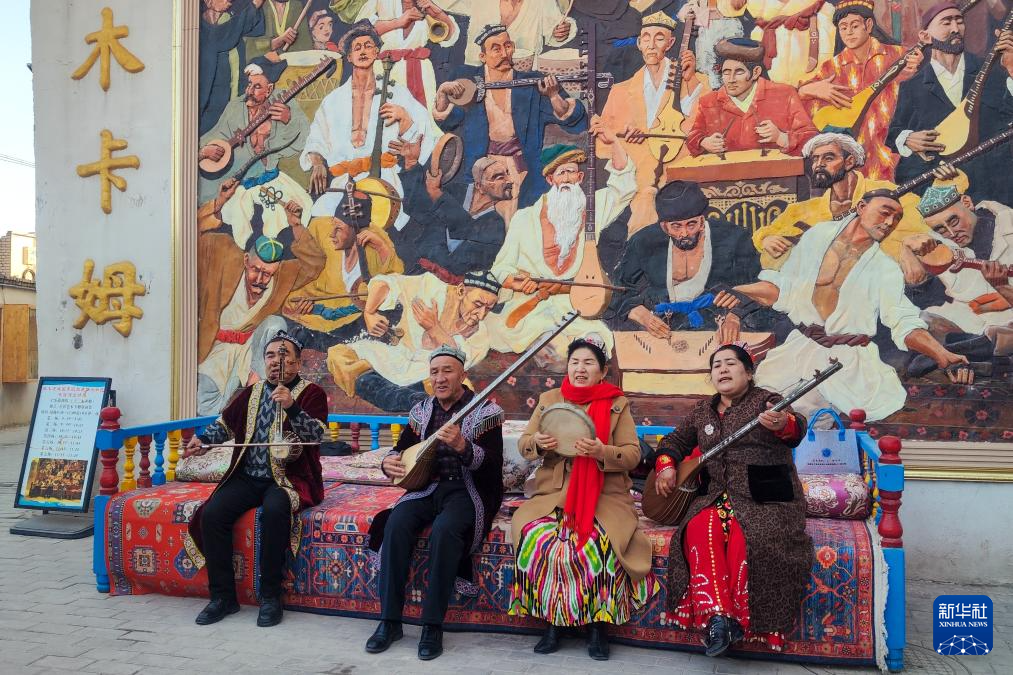 在新疆库车市花帽巷,演艺人员进行木卡姆表演(2025年11月10日摄)。