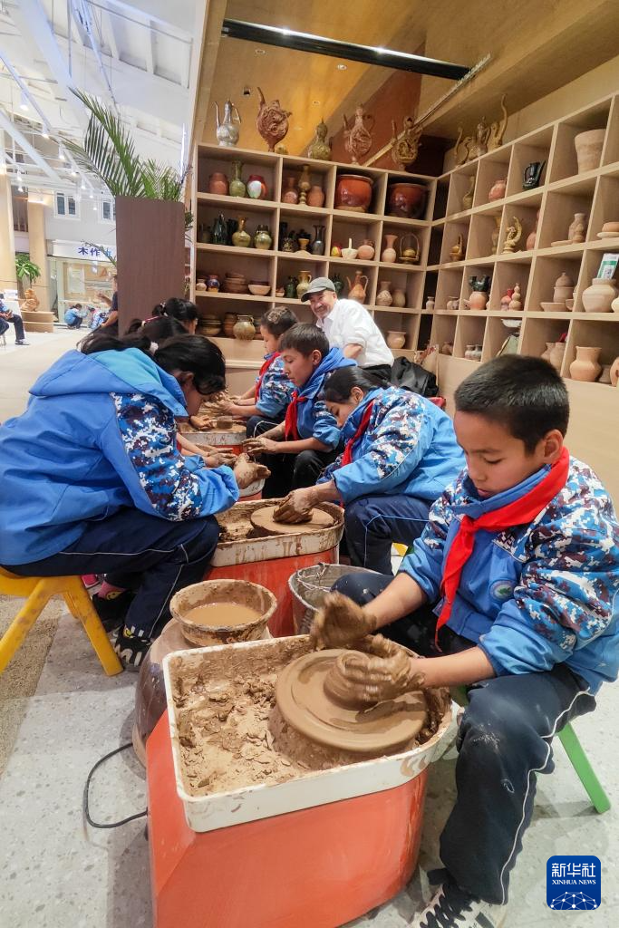 在新疆库车市龟兹非遗工坊,研学学生体验土陶制作(2025年11月10日摄)。
