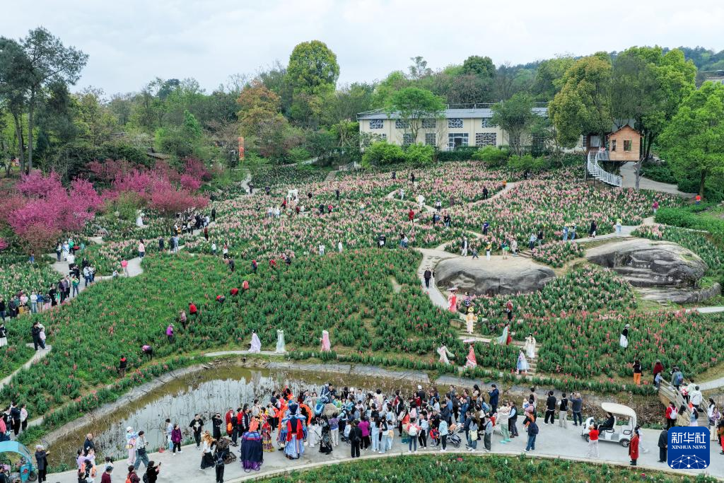 3月22日,在重庆市巴南区二圣镇集体村云林天乡景区,工作人员在金鱼草花海中表演。