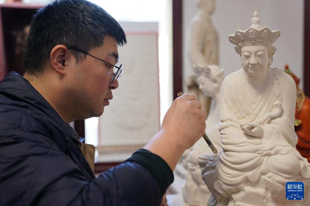 曾锐在工作室修饰“无语佛”的复制品(3月12日摄)。