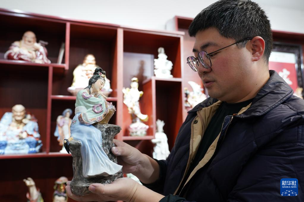 曾锐在展示家族前辈创作的雕塑瓷作品(3月12日摄)。
