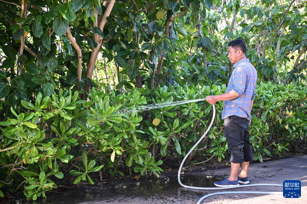 3月19日,工作人员在海南三沙赵述岛用淡化水浇灌岛上绿植。