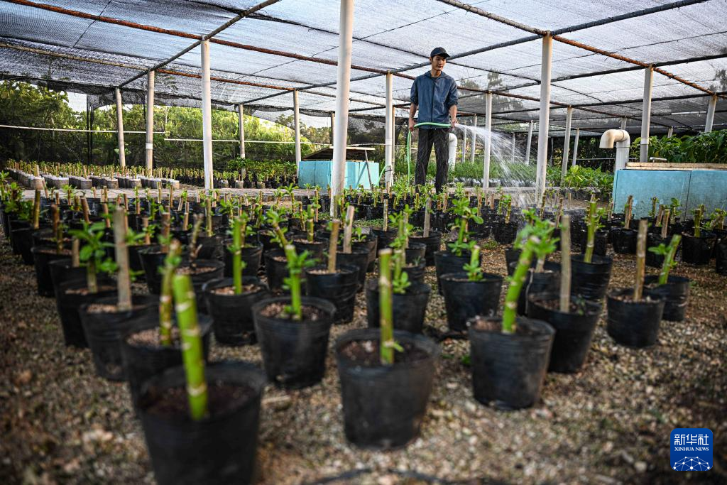3月19日,在海南三沙赵述岛苗圃,工作人员为培育的苗木浇水。